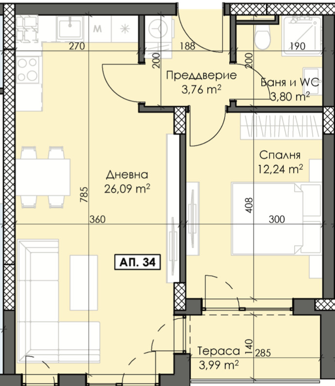 Представеният апартамент се състои от просторна дневна, баня с тоалетна, спалня и тераса с източно изложение