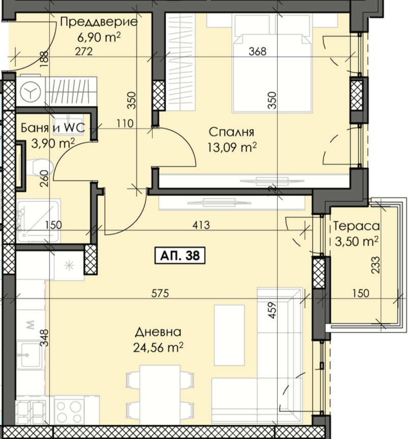 Представеният апартамент се състои от просторна дневна, баня с тоалетна, спалня и тераса със източно изложение