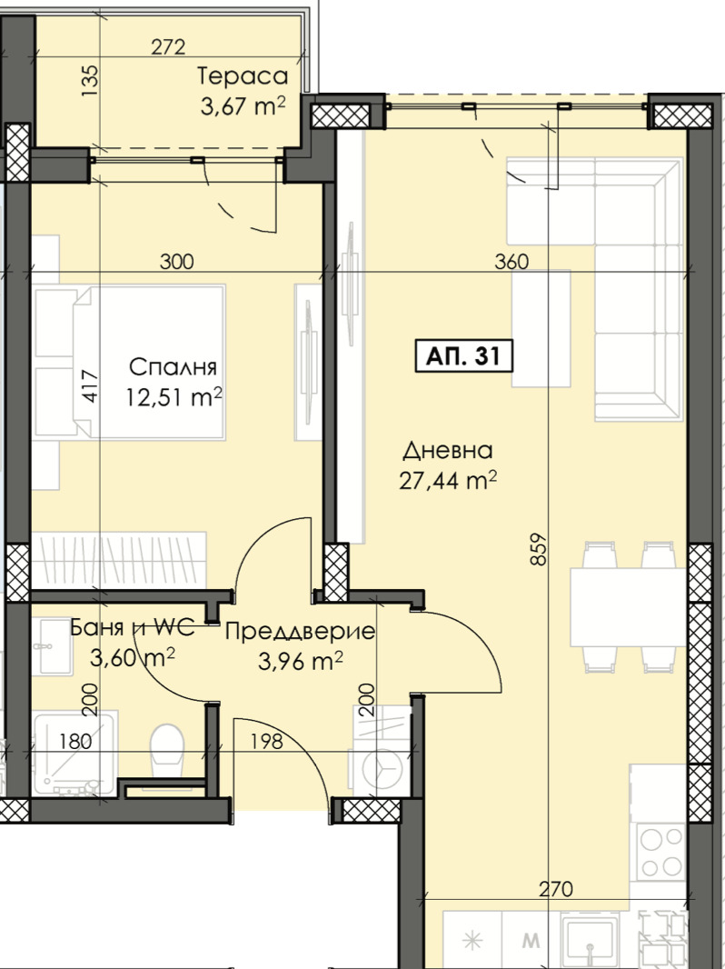 Представеният апартамент се състои от просторна дневна, баня с тоалетна, спалня и тераса с западно изложение