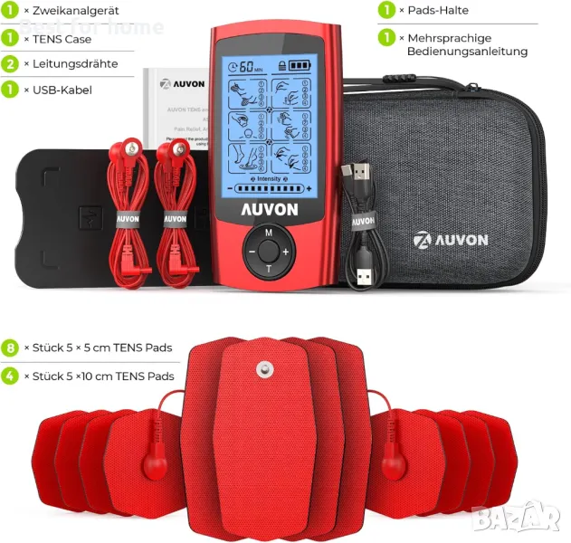 Устройство AUVON TENS с EVA калъф за носене, акумулаторно устройство за лечение на болка с 24 тренировъчни програми, 2 канала Red TENS, 12 първокласни електрода с патентован дизайн