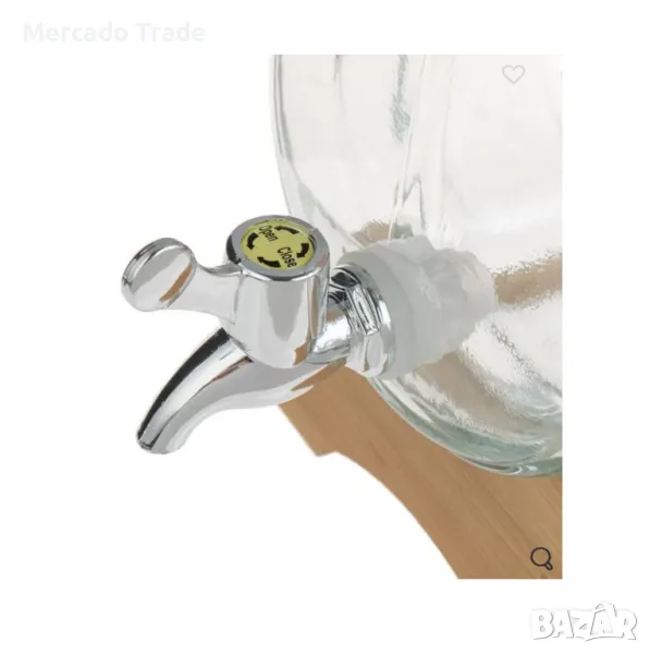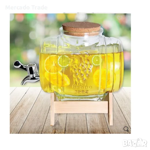 с релефен дизайн на грозде. Има отвор отгоре Ø9.5см, който се затваря с тапа, пластмасов кран и дървена основа за фиксиране. Кранът е със силиконова основа за предотвратяване на течове. Налейте с вино или друга напитка по ваш избор и сервирайте лесно.