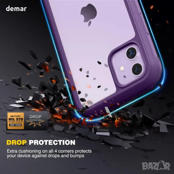 360-градусова пълна защита с двуслоен дизайн, осигуряващ абсорбиране на удари и защита срещу изпускания за iPhone 11. Вграден чувствителен на допир и устойчив на надраскване протектор на екрана защитава дисплея от повреди. Има повдигнати ръбове (2,2 мм за екрана, 1,3 мм за камерата) за допълнителна защита. Поддържа безжично зареждане без нужда от премахване на калъфа.