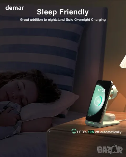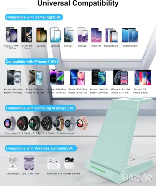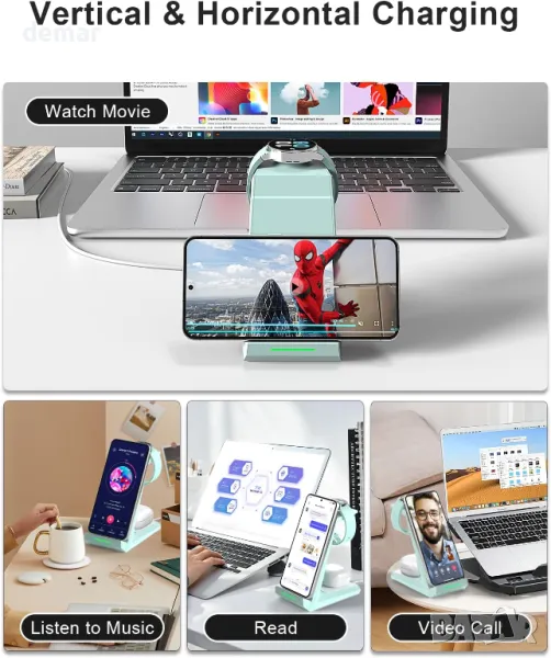 Безжичната зарядна станция 3 в 1 от ADADPU зарежда едновременно Samsung телефон, Galaxy часовник и Galaxy Buds Pro, подходяща за домашна и офис употреба. Съвместима с Qi устройства, тя поддържа зареждане с калъфи до 0,2 инча и включва QC3.0 бързо зарядно. Може да зарежда телефона вертикално и хоризонтално, с функции за безопасност като контрол на температурата и защита от пренапрежение. Пакетът включва стойка, бързо зарядно, USB Type C.