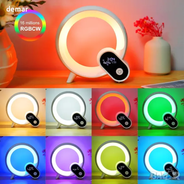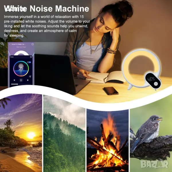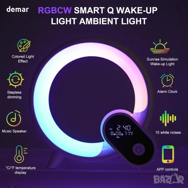 Будилник със светлина за събуждане, таймер и функция за обратно броене, предлагащ разнообразие от RGB цветове, студено/топло бяло и 12 динамични ефекта. Включва машина за бял шум с 15 звука за релаксация и безжичен BT високоговорител за лесно стриймване на музика. Управлява се чрез Smart APP за регулиране на яркост, цветове, звукови режими и настройка на аларми.