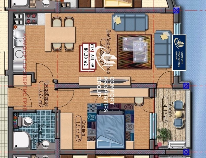 Площ на апартамента: 80.30 кв.м с общи части; 61.51 кв.м застроена площ.