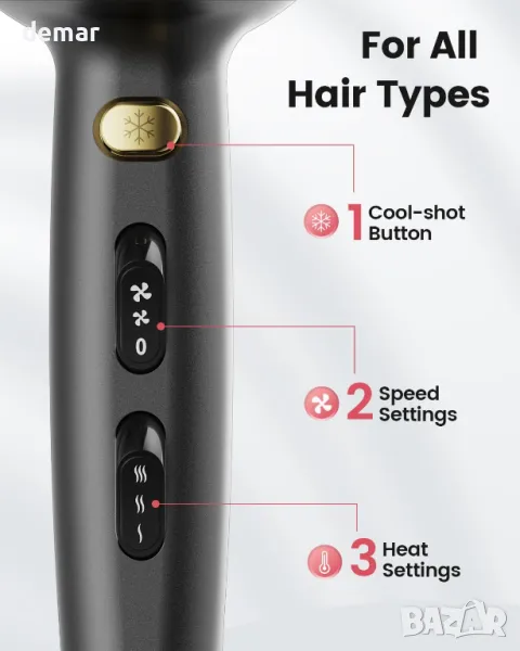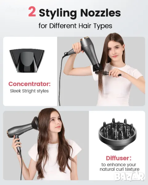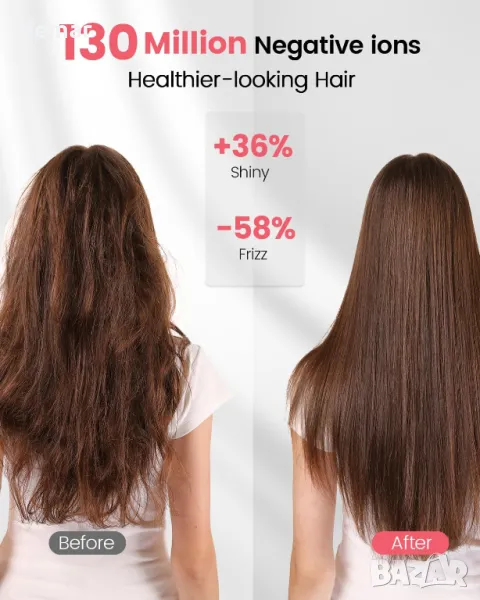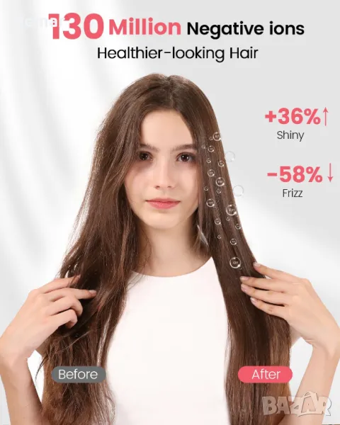 Здрав блясък и уверена визия: Йонен генератор с 130 милиона отрицателни йони, неутрализира статичното електричество, задържа влагата и намалява фриза за гладка и здрава коса.