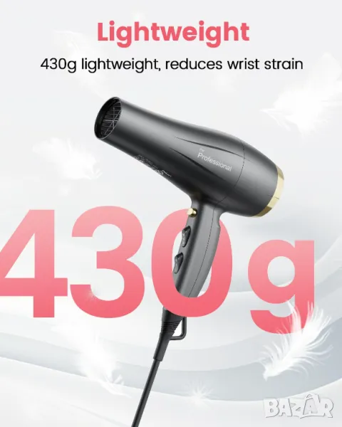 Лек и удобен: Тегло само 430 грама, ергономична дръжка за лесно и безболезнено използване дори за гъста или къдрава коса.