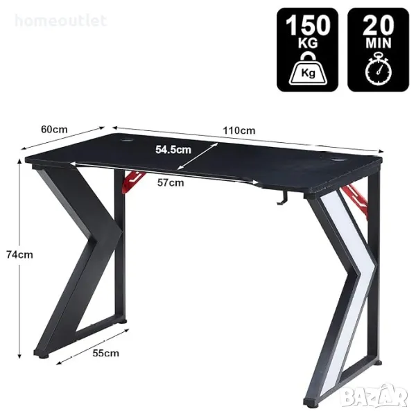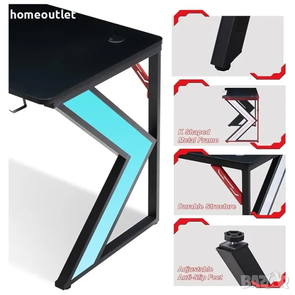 Плотът е изработен от солидна MDF ламинирана плоскост, покрита със структура от въглеродни влакна. Това компютърно бюро може да поддържа два монитора и аксесоари за игри.
