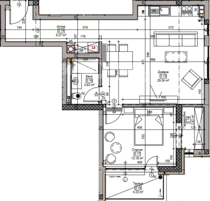 Двустаен апартамент със застроена площ от 74.52 кв.м. и обща площ от 91.85 кв.м. Разположен е на пети от осем етажа. Състои се от: дневна с кухненски бокс 29.24 кв.м., спалня 13.16 кв.м., баня с тоалетна 3.83 кв.м., гардеробно помещение 2.82 кв.м., тераса и антре.