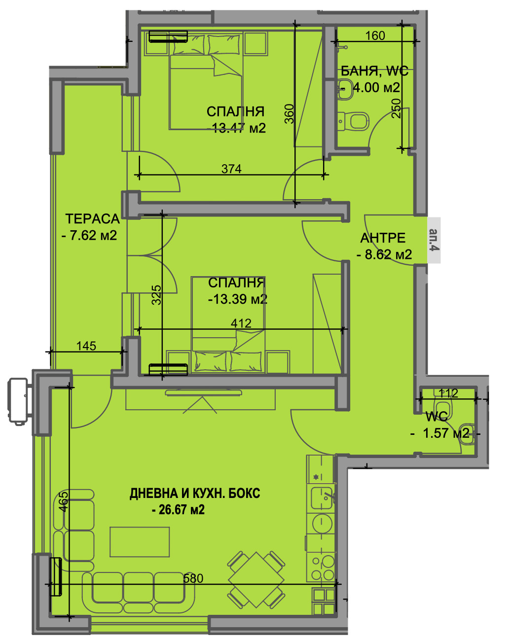 ➡Апартаментът се състои от антре, баня с тоалетна, отделно тоалетна, 2 спални, дневна с кухня и трапезария, тераса и е с обща площ от 108,2 кв.м. Изложение - юг, запад!