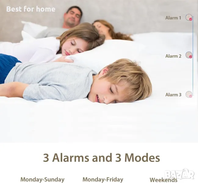 3 ОПЦИОНАЛНИ АЛАРМИ - Ако вие и вашият партньор ставате в различни часове, 3 аларми са достойна допълнителна функция. С 3 аларми можете да настроите един будилник с 3 различни времена за събуждане и да регулирате силата на звука по ваш вкус.