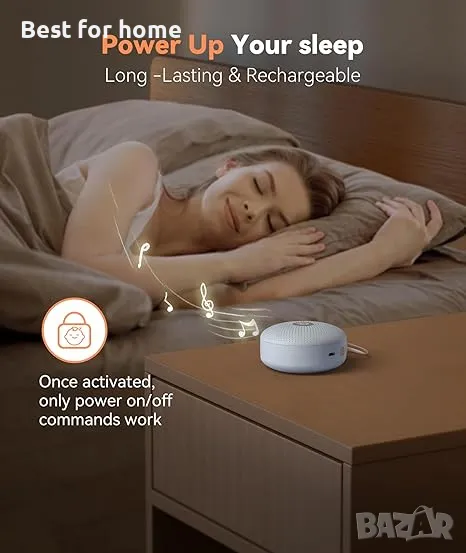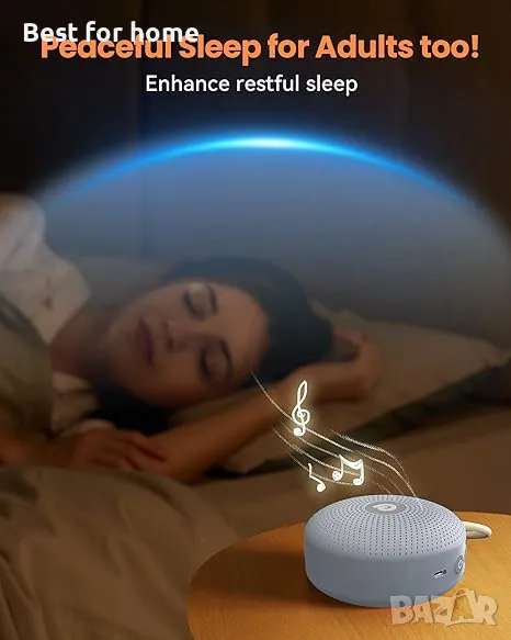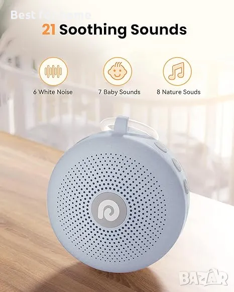 【КОМПАКТЕН, НО МОЩЕН】- Създадена за всичко свързано със съня, тази звукова машина се предлага с благоприятни функции: акумулаторна батерия, 21 успокояващи звука, персонализирани таймери, различни нива на звука, заключване за деца за безопасност и дори функции за памет! Това е не само звукова машина за залъгалка за бебета, но и ефективна машина за бял шум за спане и релаксация на възрастни.