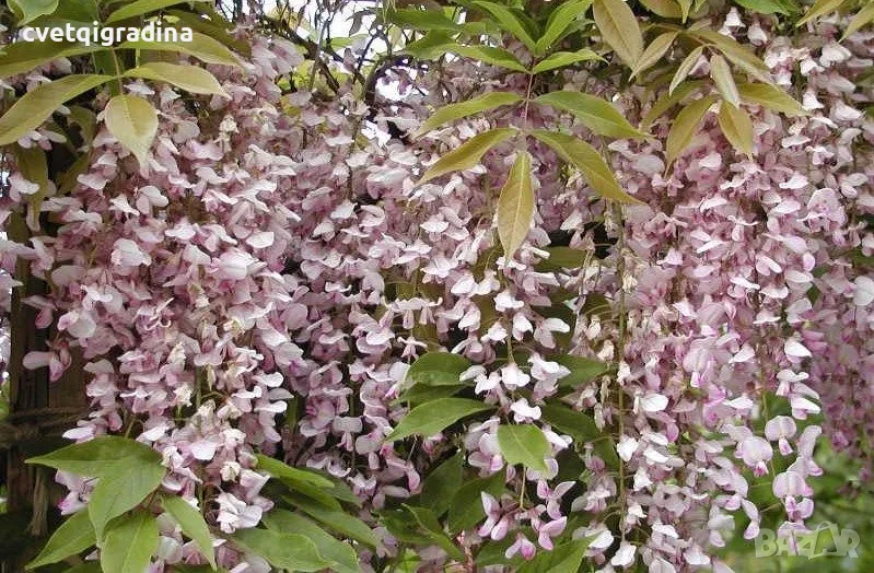 Wisteria Lipstick(Вистерия Червило)Най-енергичен и красив катерач. Известен като “Kuchibeni” в Япония. Това растение цъфти в началото на пролетта, когато се появяват бледозелени листа. Листата стават тъмнозелени, а след това в прекрасно ясно жълто през есента. Цветните съцветия са дълги 40 см, гъсто опаковани с лилаво-розови цветове, избледняващи до бели. Цветята имат сладък аромат. Много издръжлив. Подрязвайте след цъфтежа и през зимата, ако е необходимо. Подходящ за перголи или стени.