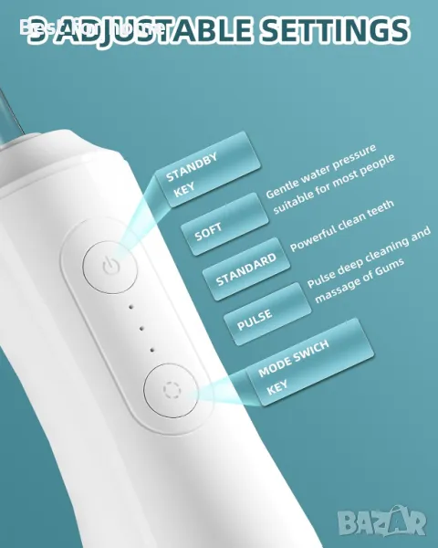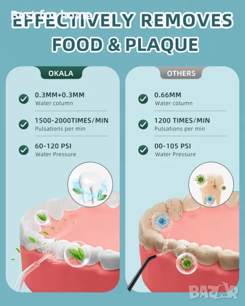 【Мощен уред за почистване на зъби с вода подобрява здравето на вашите венци】Метка за конец за зъби с вода OKALA разполага с мощен мотор, генериращ 1500-2000 пъти/мин и осигуряващ силно водно налягане от 60-120PSI за премахване на скритата дълбочина на устата, ефективен масаж на венците и насърчаване на кръвообращението. Този преносим конец за вода може ефективно да реши и предотврати различни проблеми като плака, кървене от венците, лош дъх, ортодонтия и гниене.