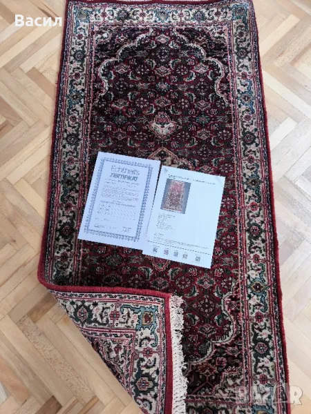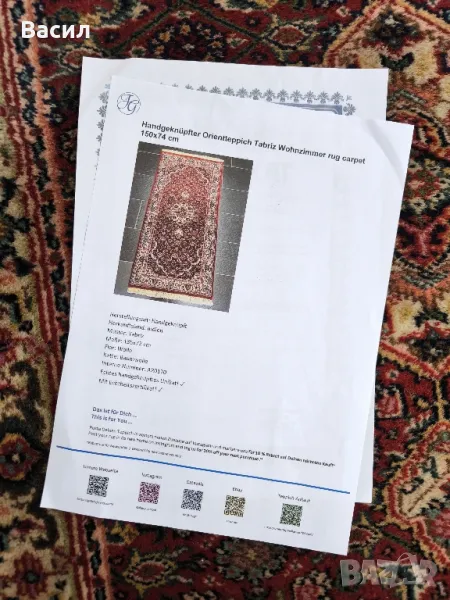 СЕРТИФИКАТ ЗА АВТЕНТИЧНОСТПроизведено в ИндияГАРАНТИРАНО РЪЧНО ПЛЕТИВОПровинция ТабризПроизведено в ИндияМалка: 135х72 см