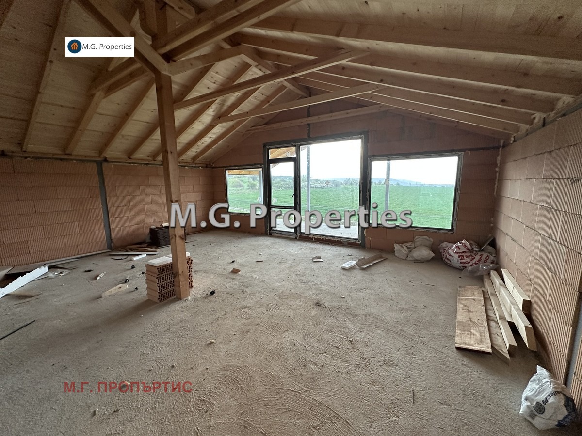 Втори етаж: голяма стая 47 кв.м. (с възможност за разпределение на две спални и санитарен възел), панорамна тераса.