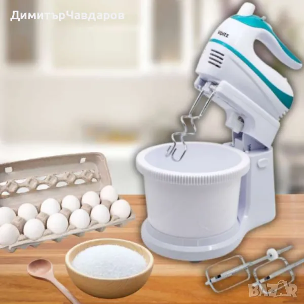 Миксер с 5 скорости, турбо функция и въртяща се купа.
