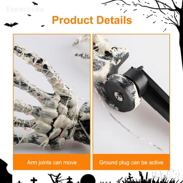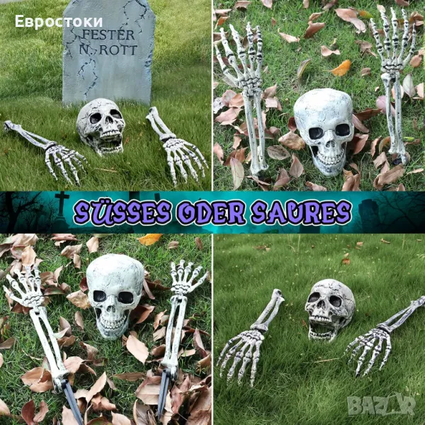 Реалистичен и плашещ: този реалистичен скелет с човешки размери симулира останки от тяло, заклещено в земята, и предлага истински празник, пълен с тръпка. Главата-скелет с подвижна челюст и регулируеми ръце ви позволява да заемете всяка поза, която искате за още по-впечатляващ ефект.
