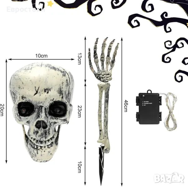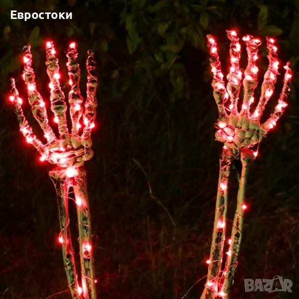 Декорация със скелет: придайте страховит щрих на вашия Хелоуин с нашия светещ комплект за декорация на скелет, състоящ се от скелет и две ръце. Предлага се в лилаво и зелено и е идеален за създаване на страховита атмосфера, независимо дали на закрито или на открито