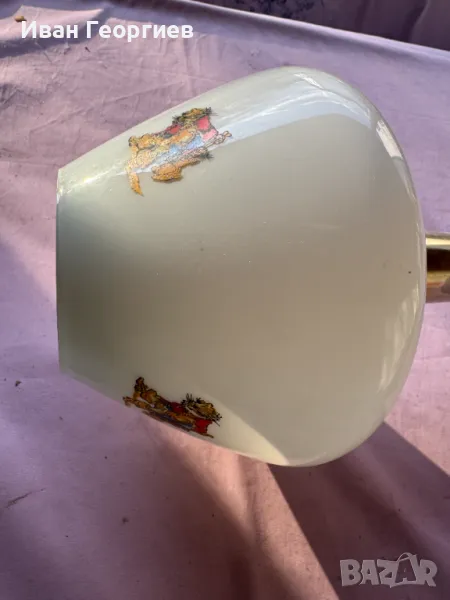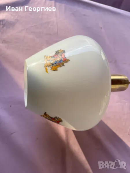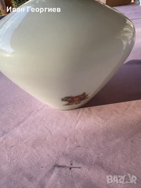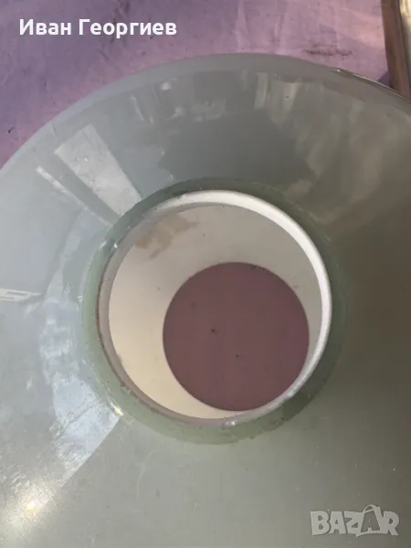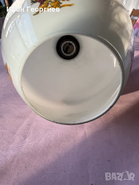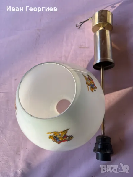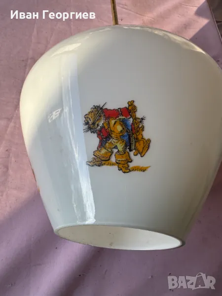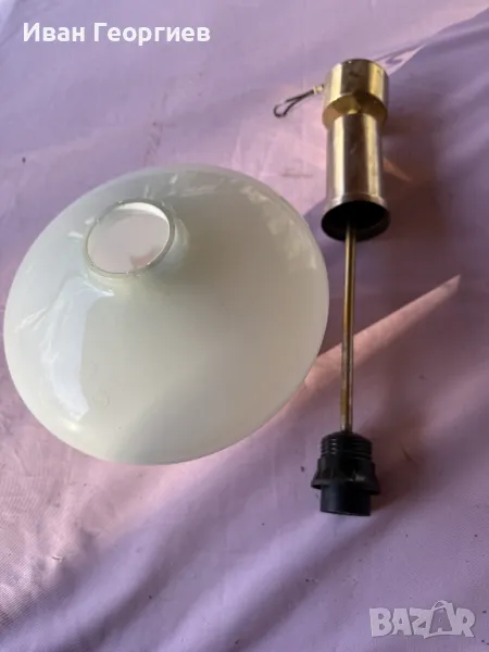 Продавам употребявана лампа за таван в комплект с държача към тавана с фсунга Е27. Ориентировъчни габаритни размери на пендела (бялото стъклено тяло) - ширина Ф24см, височина 20,5см .