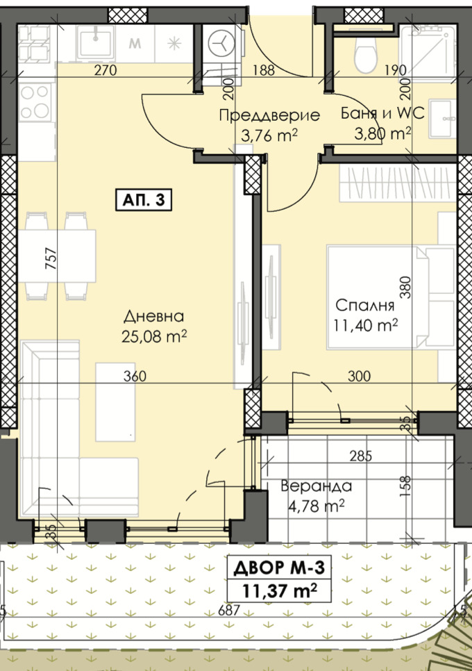 Представеният апартамент се състои от просторна дневна, баня с тоалетна,спалня и веранда с двор с южно изложение