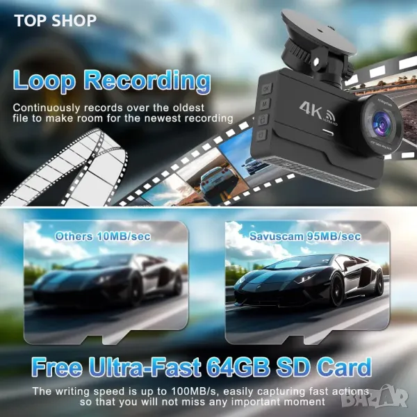 DYNACAM 4K/2K+1080P Dash Cam отпред и отзад, 64GB карта, 170°широк ъгъл, G-сензор,