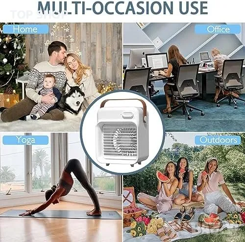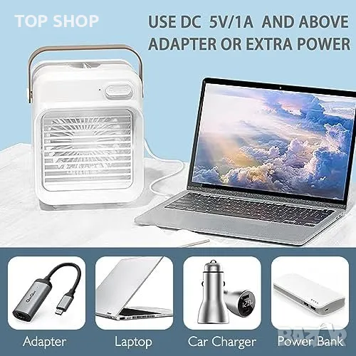 Преносимост: С компактния си размер и вградената дръжка за носене този мини климатик е изключително преносим. Той може да се захранва чрез USB кабел, което го прави съвместим със захранващи банки, лаптопи, зарядни устройства за автомобили и др.