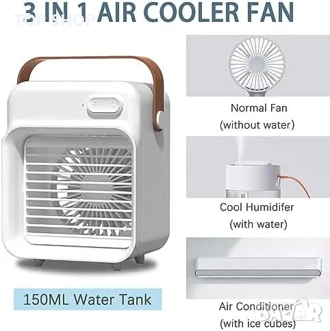 климатик 3 в 1: Този преносим охладител на въздуха съчетава функциите на вентилатор, малък климатик и овлажнител на въздуха в едно компактно устройство. Той осигурява универсални възможности за охлаждане и овлажняване в едно устройство.