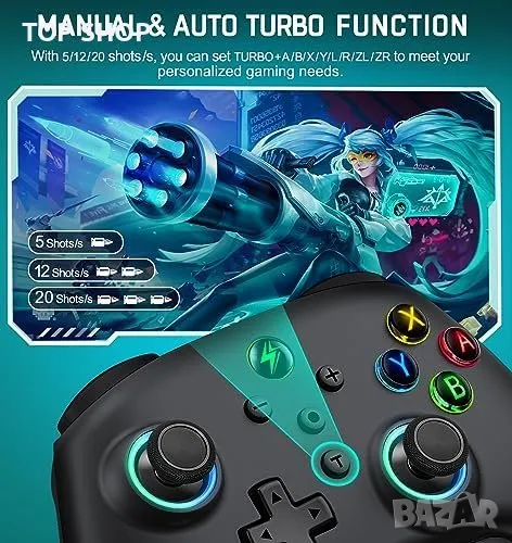Персонализирайте геймплея си с макрофункционалния клавиш [M], който ви позволява да картографирате основни функции, създавайки до 20 комбинирани функции, пригодени за различни игри. Контролерът поддържа режим Auto TURBO/Manual TURBO с регулируеми скорости: 5 изстрела/сек, 12 изстрела/сек и 20 изстрела/сек.