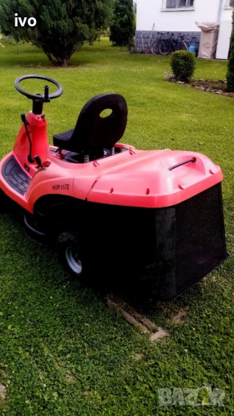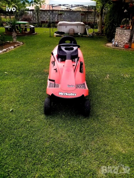 трактор косачка Herkules E 72 hidro двигател briggs&stratton 12 конски сили въздушно охлаждане ел стартер задвижване хидро напред и назад косилен апарат с обхват на косене 72 см задно изсхвърляне на тревата или събиране в коша машинката е произведа в италиа през 2013г работи много добре