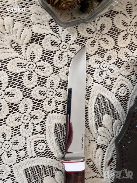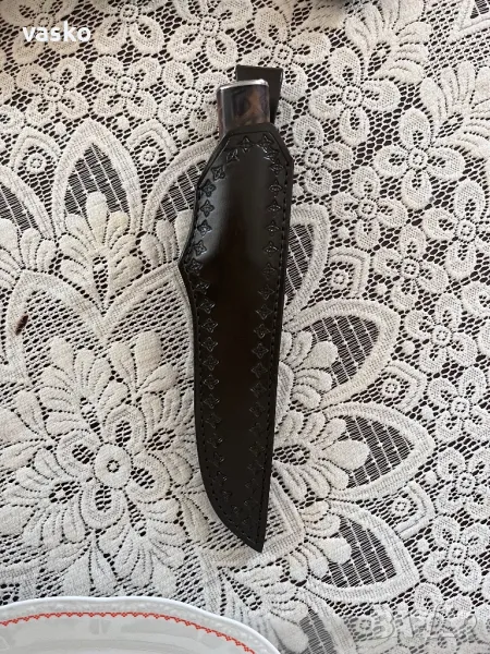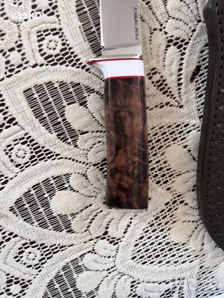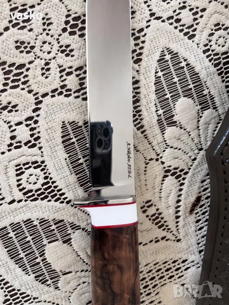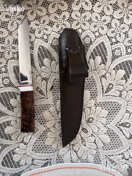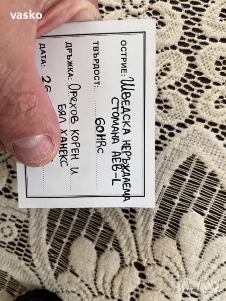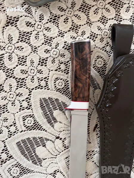Нож от шведска неръждаема стомана,обща дължина 29,5см,ширина на острие 3см,дебелина на острие 2мм,закален на 60 еденици,дръжка орехов корен и бял ханекс-сниман е сертификата,снимана е и маркировката,кожена кания правена специално за ножа.Ножа е нов и никога не е ползван.