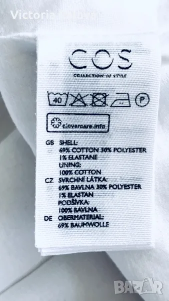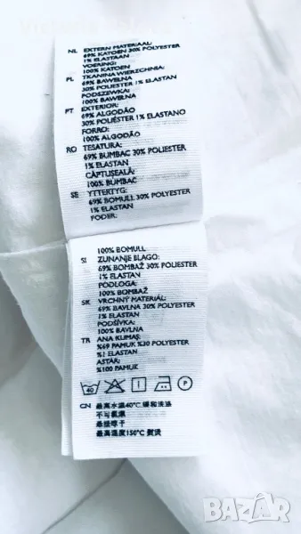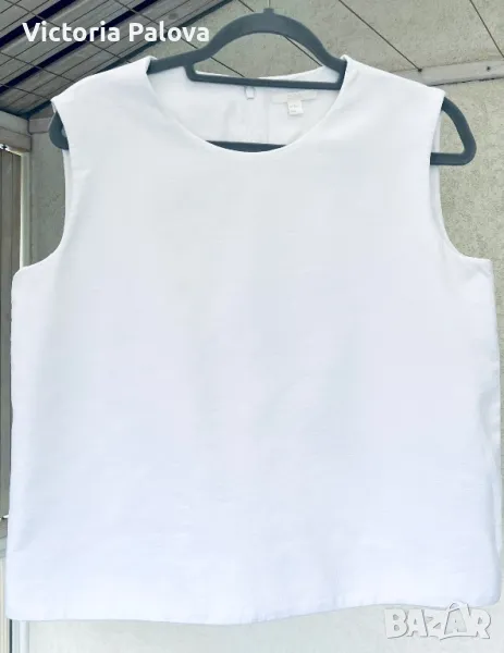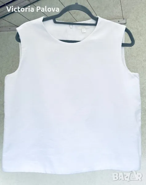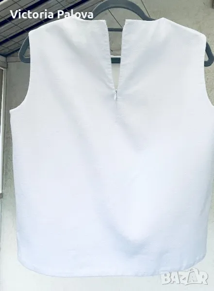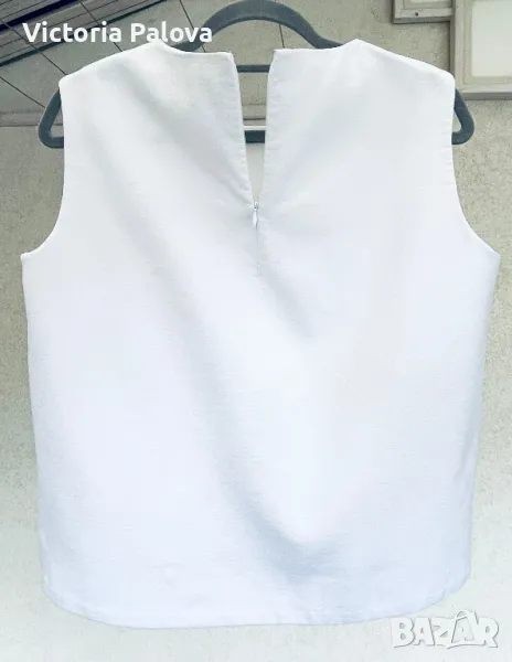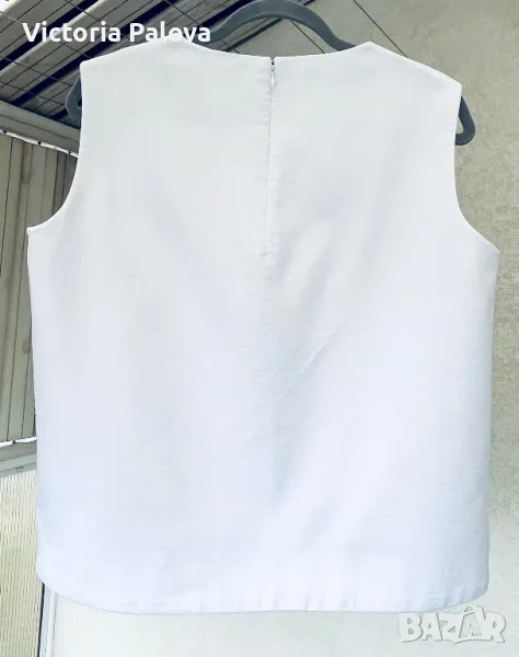 Красив и стилен топ с подплата, която е 100% памучна. Външната материя е 69% памук, 30% полиестер и 1% еластан. Рамо - 40-41см, ГО - 52см, дължина - 58см, в долния край широчината е 55,5 см. Последната снимка не е продуктова, а примерна, предлаганият топ е по- красив.