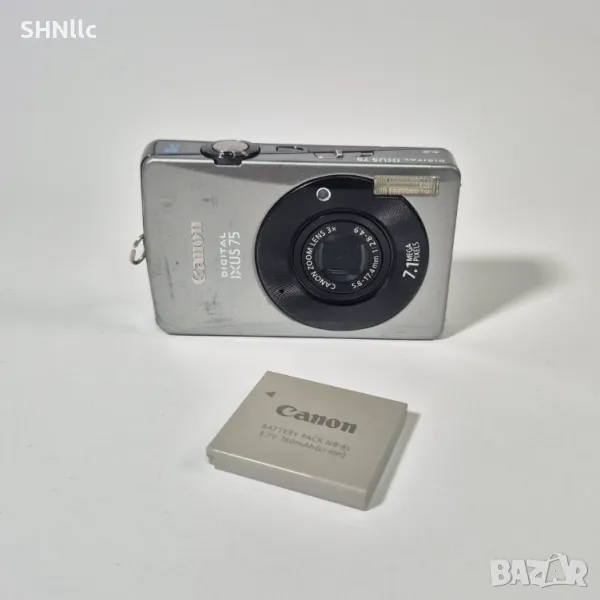 Цифров фотоапарат CANON IXUS 75 в работещо състояние. Има следи от употреба по корпуса на камерата. В цената се включва батерия. Няма зарядно или SD карта. Липсва гумичката на капечето на батерията. За повече информация пишете.
