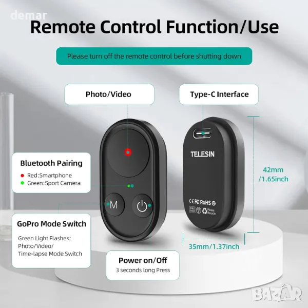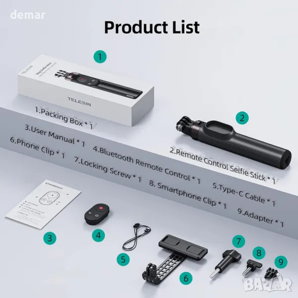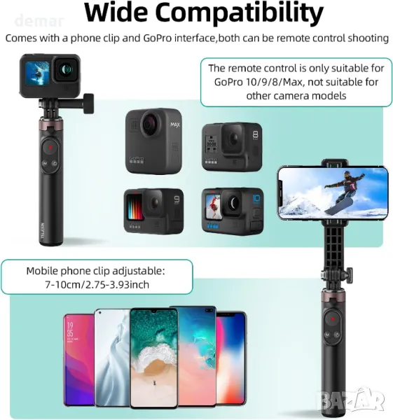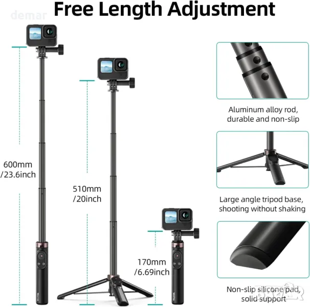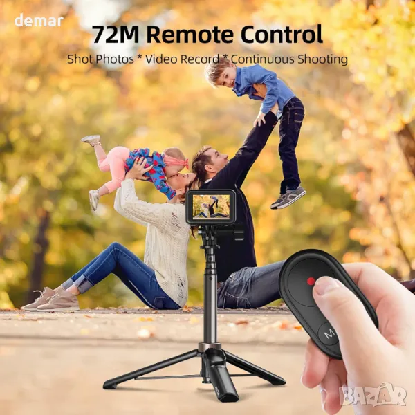 AuyKoo 3-in-1 селфи стик-статив с интегрирано магнитно дистанционно управление и безжична Bluetooth връзка, съвместим с GoPro Hero 10/9/8 Black, GoPro Max и смартфони. Обхват на дистанционното до 72 метра, без нужда от приложение. Разширяем от 17 до 60 сантиметра, подходящ за почти всички телефони с клип за телефон 57-103 мм. Изработен от лек и корозионноустойчив алуминиев материал, осигурява лесно превключване между хоризонтални и вертикални снимки. Компактен и удобен за носене, идеален за пътувания, партита и дейности на открито.
