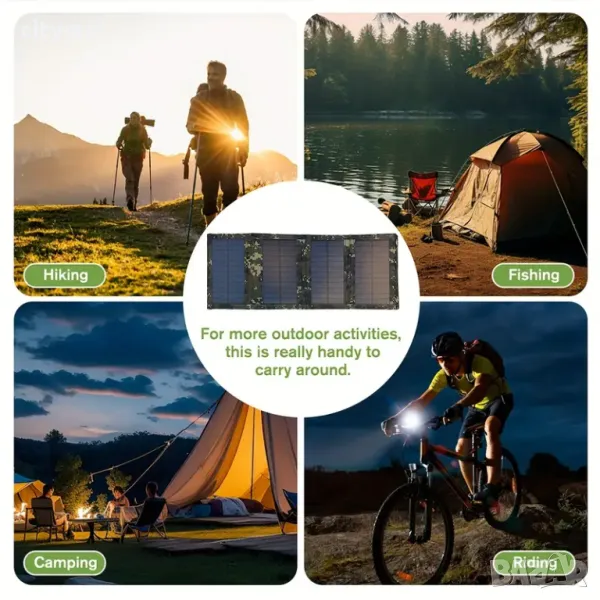 Зареждане от силата на слънцето. Без да се налага да разчитате на стенен контакт или Power bank и ви осигурява начин на живот без контакт. Преносимото слънчево зарядно устройство е подходящо за дейности на открито като къмпинг, туризъм, пикник и др. Може да се използва и при спешни случаи и друга работа на открито.В сгънато състояние соларното зарядно изглежда като тефтер, лесен за транспортиране. Когато е разгънат, той може да виси на вашата раница, палатка или просто да се разпъне на плажа, за да ви даде моментално зареждане от слънчева светлина. Направено от превъзходна PET водоустойчива тъкан за подобряване на издръжливостта на открито. Екологично чист, водоустойчив, издръжлив и чувствителен.