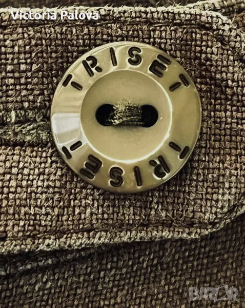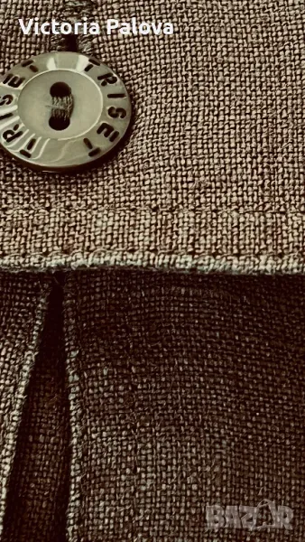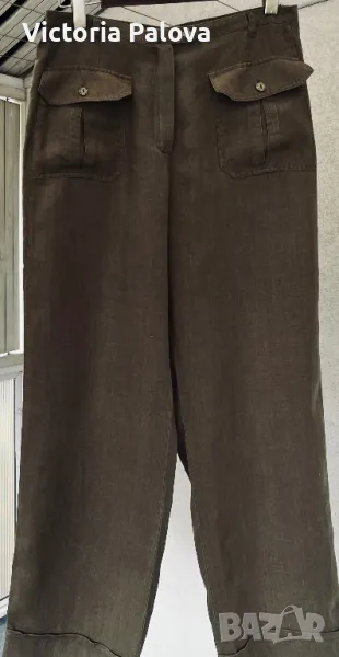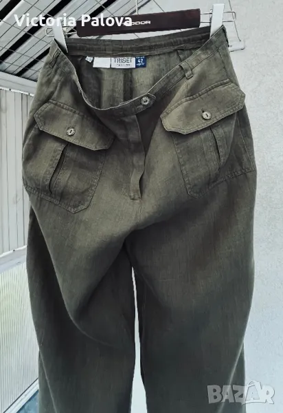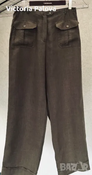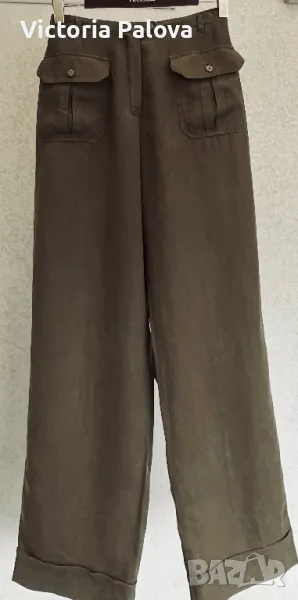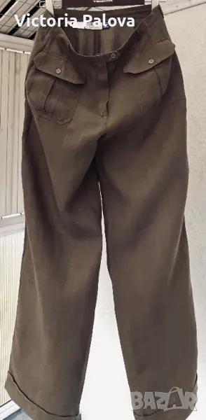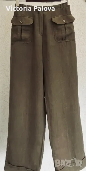 Актуален цвят и кройка, комфортен и красив панталон от лен с модерни детайли - цвят, джобове, широк свободен крачол, брандирани копчета. Талия - 41см, дължина - 102,5см, отвътре крачолът е 75см, широчината му горе - 35см, долу - 23,5см.