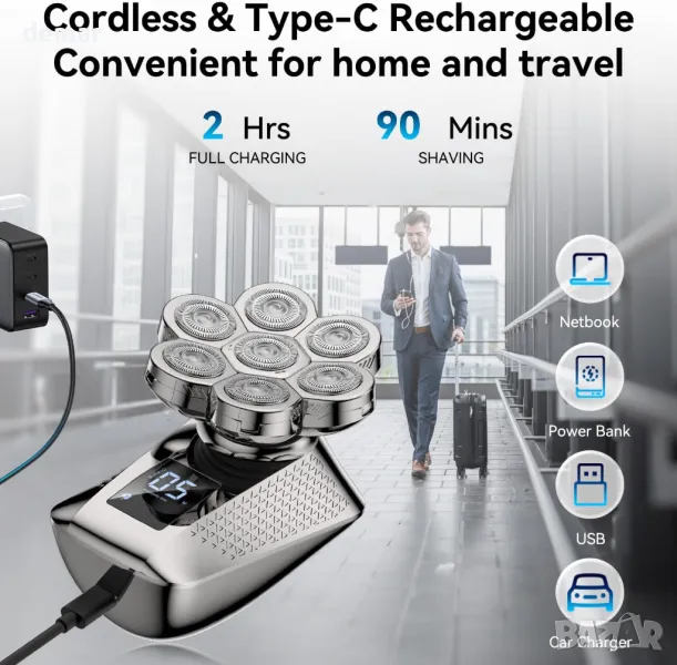 7D самобръсначка с плаваща глава, създадена за прецизност и комфорт. Неговите гъвкави въртящи се ножове без усилие се адаптират към контурите на лицето, осигурявайки гладко бръснене всеки път. С двойни прецизни глави, той минимизира раздразнението и осигурява гладко плъзгане, докато комплектът 5 в 1 предлага гъвкавост за всички нужди за поддържане. Насладете се на бързо зареждане с 90 минути безжична употреба, а неговият IPX7 водоустойчив дизайн позволява както мокро, така и сухо бръснене. Забележка: Поддържа само 5V 1A зареждане.