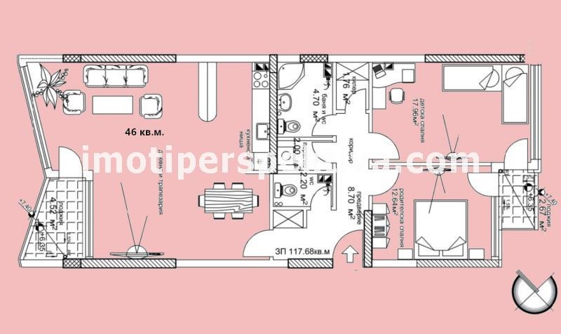 - Разпределение: 46 кв.м. просторна дневна и кухненски кът и трапезария с красива панорамна гледка към тепетата и Стария град, две големи спални(18 и 13 кв.м.) с изглед към Родопите, дрешник, перално помещение, баня с тоалетна, втора тоалетна, две тераси.
