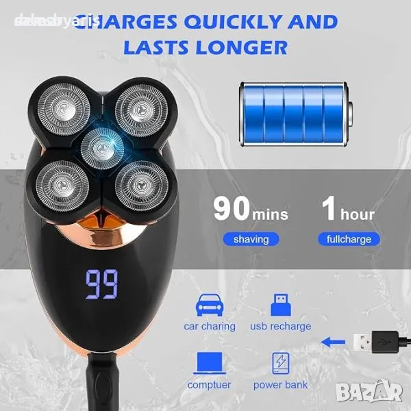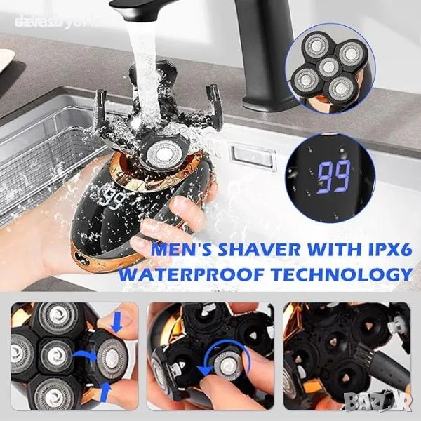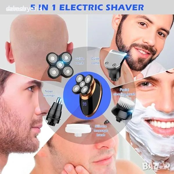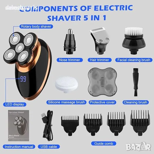 Мултифункционален комплект за подстригване за мъже, включващ 5 подвижни приставки, включително електрическа самобръсначка, машинка за подстригване, машина за подстригване на косми в носа, машина за подстригване на бакенбарди и четка за почистване на лице. С управление с един бутон и бързо USB зареждане, той е лесен за използване и поддръжка. Дизайнът на 4D въртяща се плаваща глава осигурява гладко и удобно бръснене на лицето, шията и брадичката. Освен това е водоустойчив IPX7 за удобство при мокро или сухо бръснене, а подвижната бръснеща глава позволява лесно почистване. Кажете здравей на лесното подстригване с този универсален и ефективен комплект за подстригване.