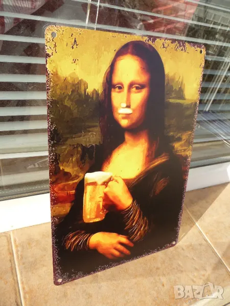 Метална табела Мона Лиза с бира в ръка и пяна на носа мустаци шарж