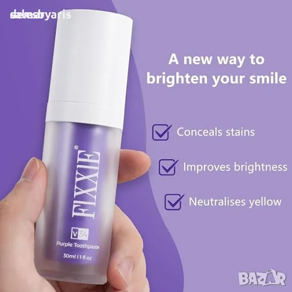 Изпитайте мощно избелване на зъбите с лилавата паста за зъби FIXXIE V34, предназначена да неутрализира жълтите нюанси и да възстанови естествената яркост. Нежен и безболезнен, той е формулиран така, че да е безопасен за емайла, като същевременно ефективно избелва. Удобен и лесен за използване, той опростява ежедневната ви грижа за устната кухина. Направен с естествени съставки като сорбитол и ксилитол, той осигурява пълна защита на венците и зъбите. Насладете се на дълготраен свеж дъх и увереност с всяка усмивка. Освен избелването, той премахва упорити петна от кафе, чай и тютюн, идеален за почистване на чувствителни зъби.