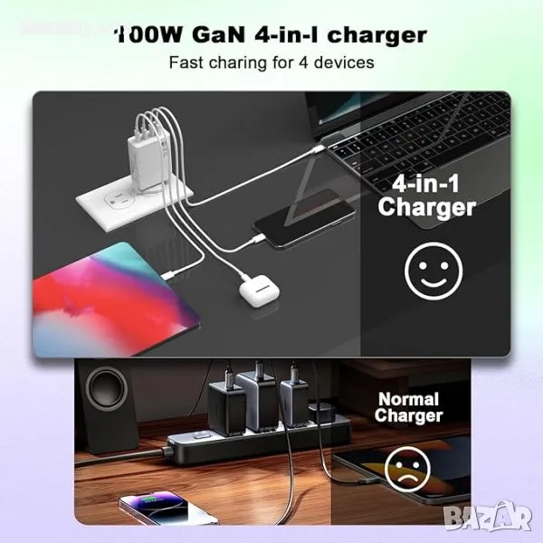 100W зарядно устройство с GaN технология, предназначено за ефективно зареждане с по-малко консумация на енергия и генериране на топлина. С 3 USB-C порта (100 W всеки) и 1 USB-A порт (до 18 W) можете да зареждате няколко устройства едновременно, включително смартфони, таблети, лаптопи и други, всички с бързи скорости на зареждане. Съвместим с различни протоколи за бързо зареждане, той поддържа повечето USB-C и USB-A устройства, осигурявайки оптимален ток на зареждане. Функциите за безопасност включват защита срещу пренапрежение, късо съединение, свръхток, прегряване, претоварване, анти-EMI, анти-електростатични и огнезащитни свойства, осигуряващи безпроблемно зареждане.