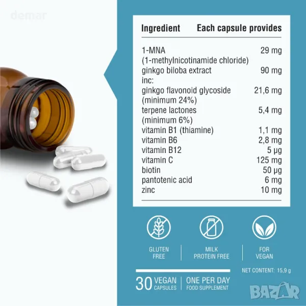 Endotelio Brain 1-MNA помага за оптимизиране на нивата на NAD+ за анти-ейджинг и дълголетие. NAD+ е важен за клетъчната функция, но с възрастта нивата му намаляват, започвайки от 30 години. 1-MNA помага за поддържането на оптимални нива на NAD+, като насърчава по-добра физическа активност, когнитивни функции и регенерация на клетките. Тази формула съдържа съставки като Гинко Билоба, Цинк, Биотин, Витамин C и витамини от група B, които подпомагат здравето на мозъка, паметта, фокуса и настроението. Добавката имитира ползите от зелен чай и вакаме, които се намират в „Сини зони“, известни с дълголетието си. Научно разработена и произведена в ЕС, е подходяща за вегани и е предназначена за ежедневна употреба.