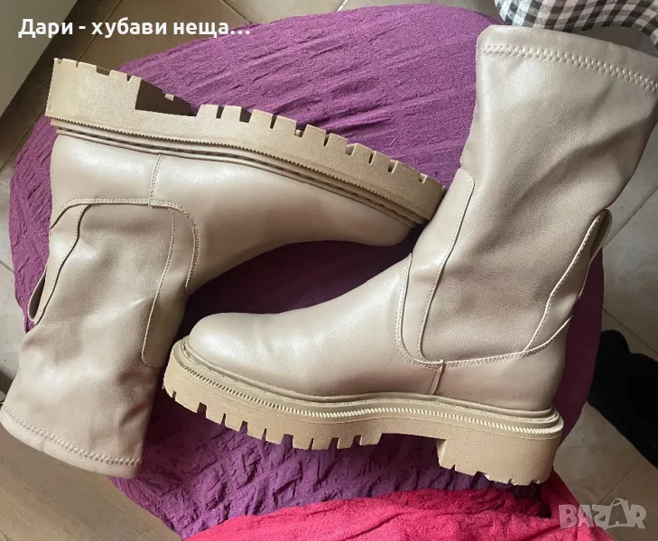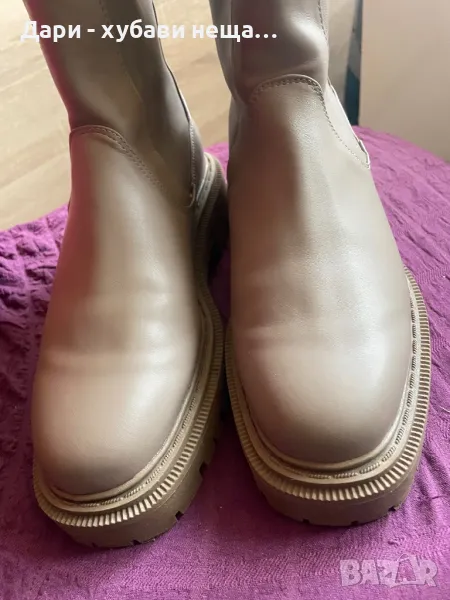 Продавам ботите, защото на мен са ми тесни.Подходящи са за много тесен крак.По етикет са 38 р-р, но са умалени и според мен са подходящи дори за дама носеща 36 р-р.Горната част е от еластична кожа (тип чорап) - много мека.Цветът е капучно.