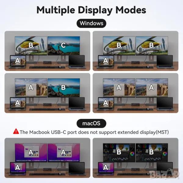 Този USB-C KVM превключвател позволява на два лаптопа с Thunderbolt 3 или по-нова версия да споделят 12-в-1 докинг станция с два DisplayPort монитора, клавиатура, мишка, USB памет и SD карти. Поддържа разделителна способност до 4K120Hz, въпреки че macOS позволява само огледален режим (без разширение за двоен екран). USB 3.2 портовете предлагат бързи 10Gbps трансфери, докато SD/MicroSD четец позволява лесно копиране на данни. Ethernet порт осигурява до 1000Mbps скорост за изтегляне, а допълнителен бутон за превключване позволява удобно разположение на работния плот. Забележка: не зарежда лаптопи, не поддържа превключване с бързи клавиши и само един лаптоп може да използва мрежата наведнъж.