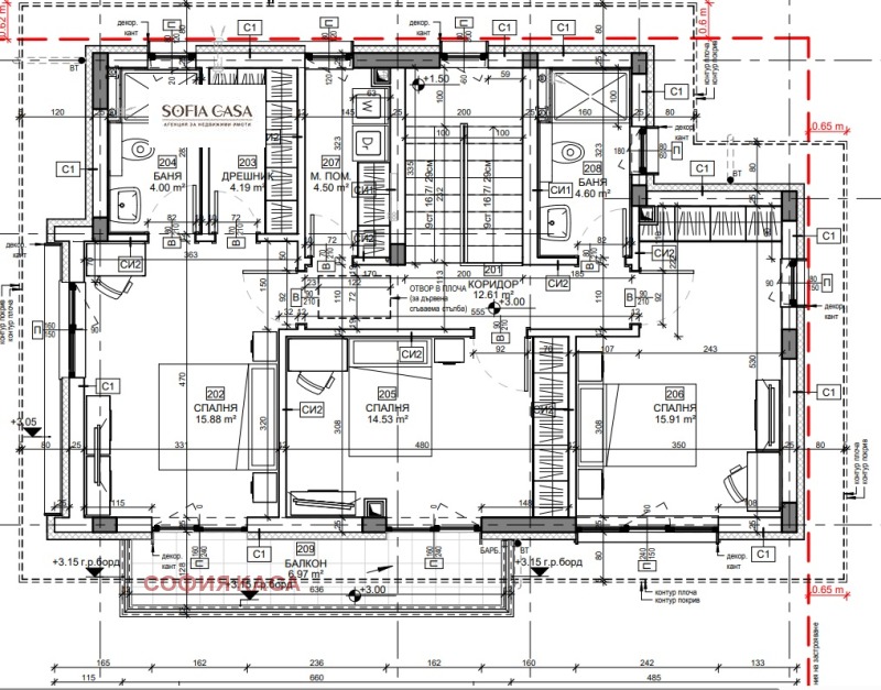 - Втори етаж - три спални, едната от която е със собствена баня с тоалетна и дрешник, отделна баня с тоалетна обслужваща другите спални, мокро помещение, коридор и тераса.