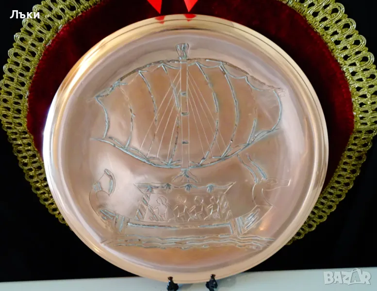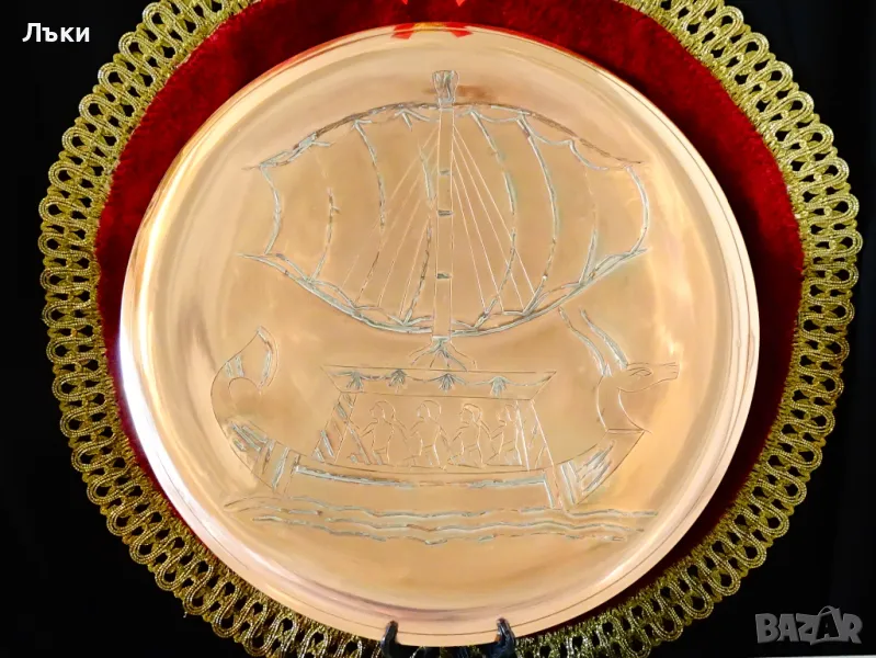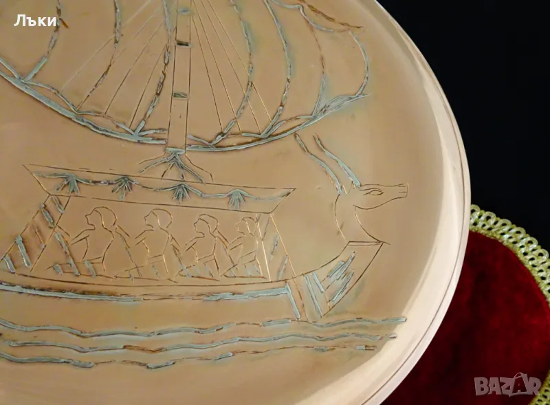 ръчна изработка от чиста червена мед и сребро.Релефно гравирана с изображение на египетски кораб с глава на Бог Анубис,галера с гребци и изпънато платно.Картината
