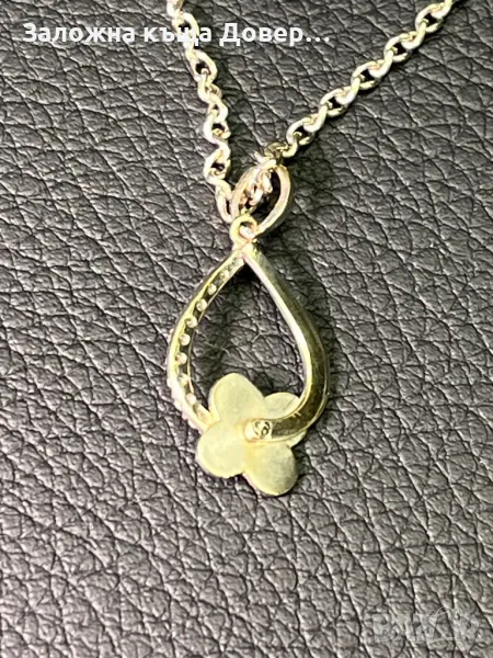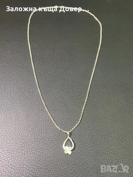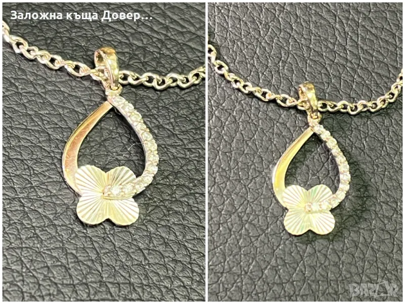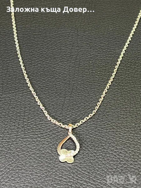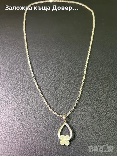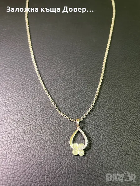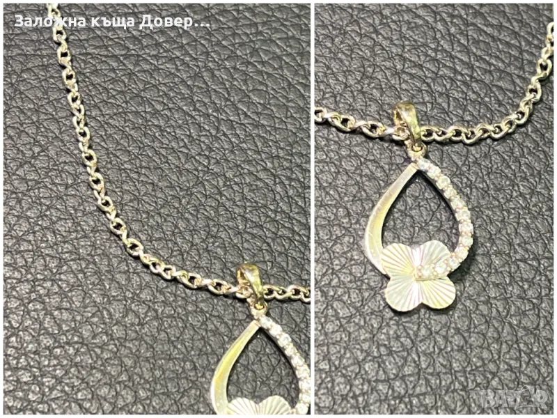 Златен синджир бяло злато и много нежна висулка брошка с циркон кристали-Изработени от 14 каратово бяло злато с проба 585 и печати! Италианска отлична изработка Перфектно състояние. Никакви забележки по синджира и висулката.Висулката е с вградени 12 циркония.Към всички наши бижута издаваме сертификат за произход - качество и касова бележка.