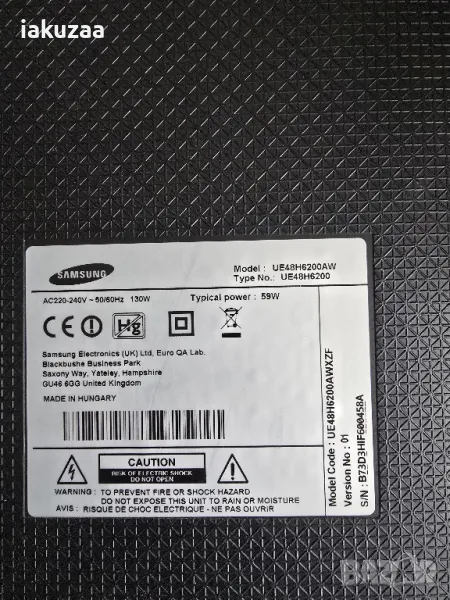 Модел: Samsung UE48H6200AW Телевизора е с проблем,има звук,свети дисплея но няма картина. Преди показваше картина с вертикални линии по средата,сега и това спря.Дисплея е здрав,няма счупено! Продава се със стойката и оригиналното дистанционно.Много е запазен. Дава се само цял! Който може да си го оправи. Може и бартер за нещо стига да ми върши работа.