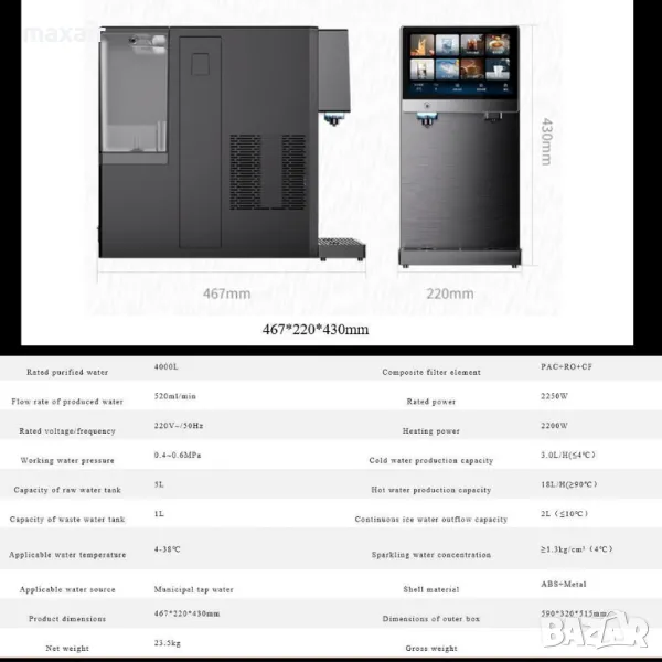 Диспенсърът може да се ползва като десктоп модел или да се свърже с водопроводната мрежа